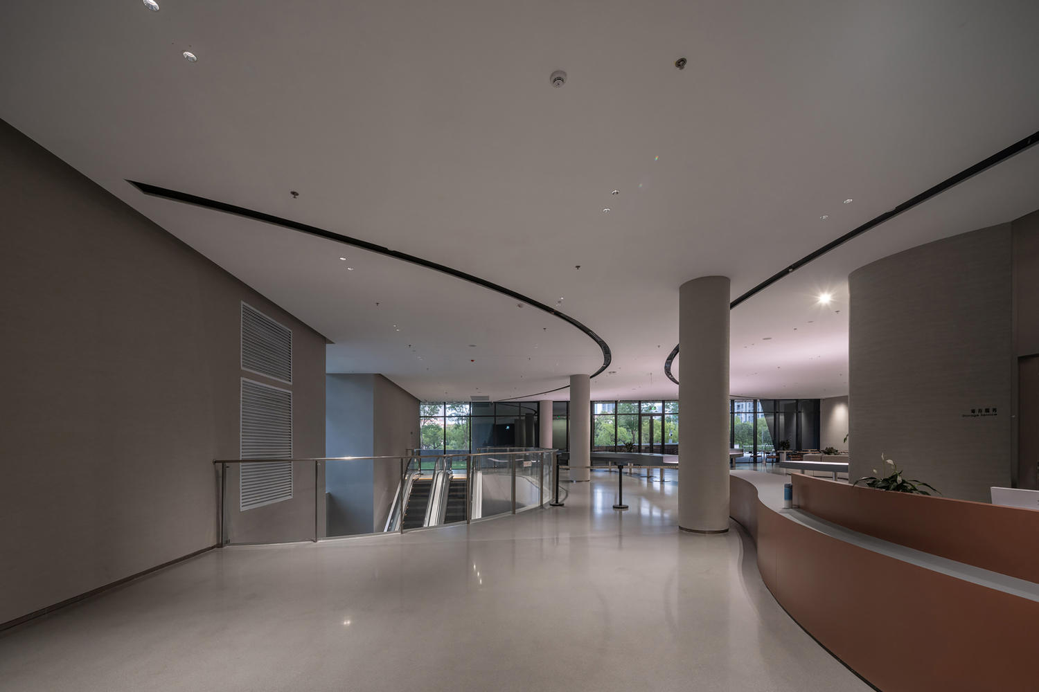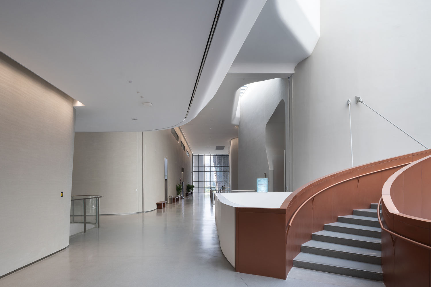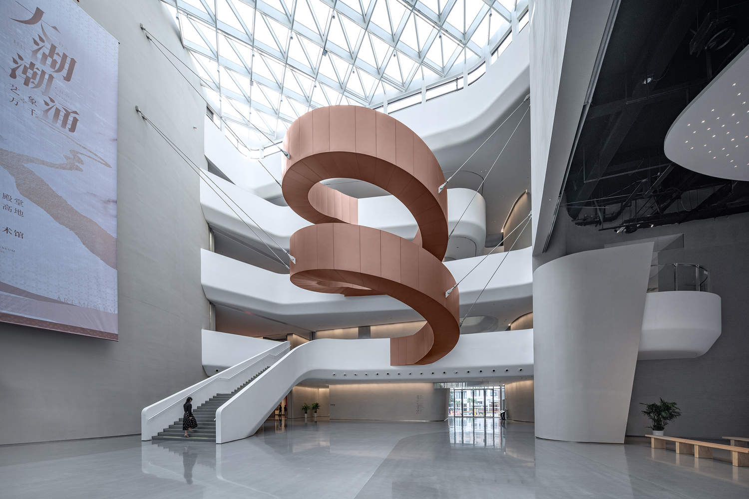 The museum's interior space continues the theme of "Flowing" and "Converging" based on the concept of sharing a source while diverging. Four huge curled "cylinders" serve as structural cores while simultaneously shaping the fluid public spaces—the Hall of Convergence and the Canyon Corridor. Coupled with the bridge truss at the main entrance and the large-sized (radius approx. 6.12 m) suspended revolving staircase, two spatial-structural highlights, they form a "complex multi-story structural system composed of various structural components."