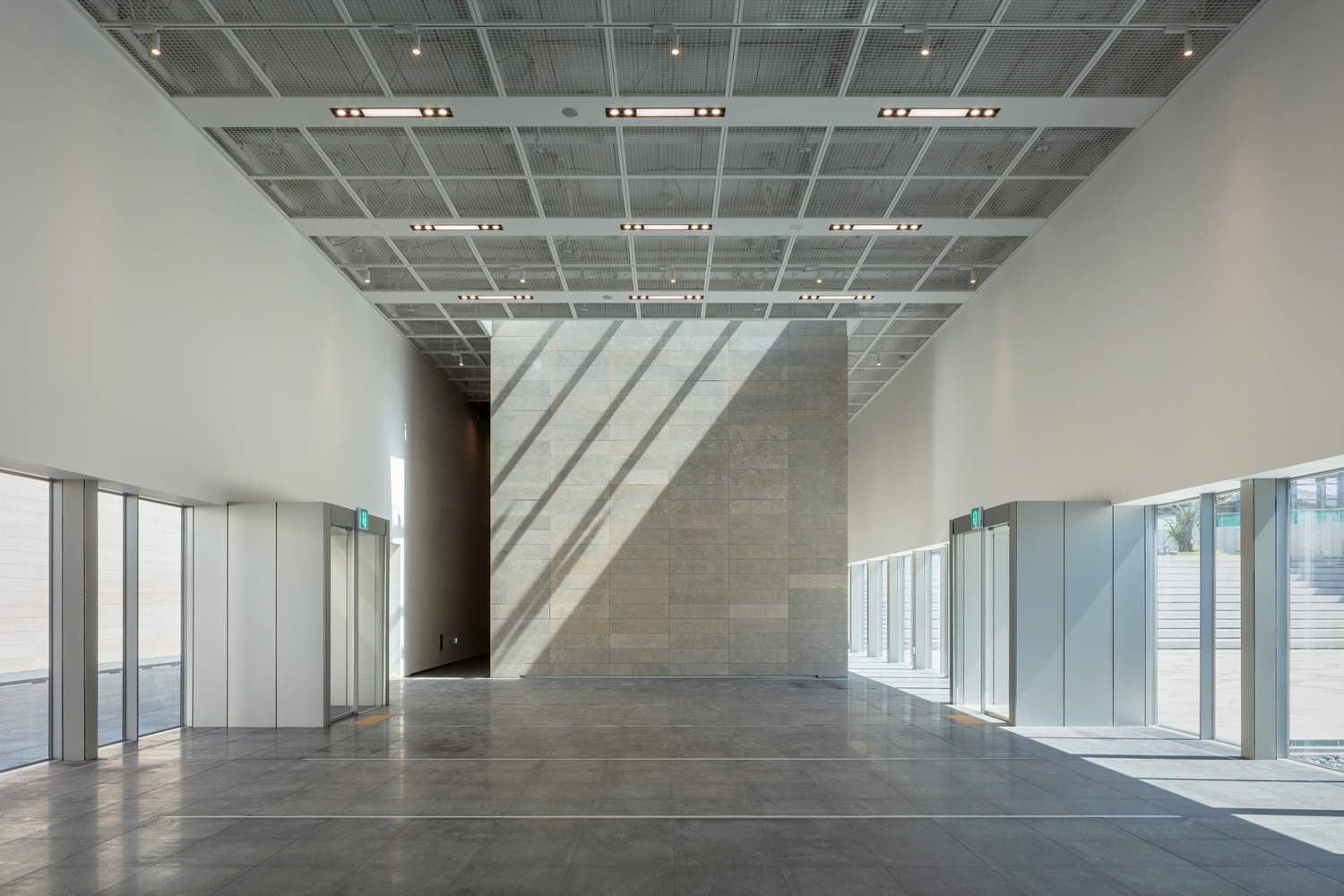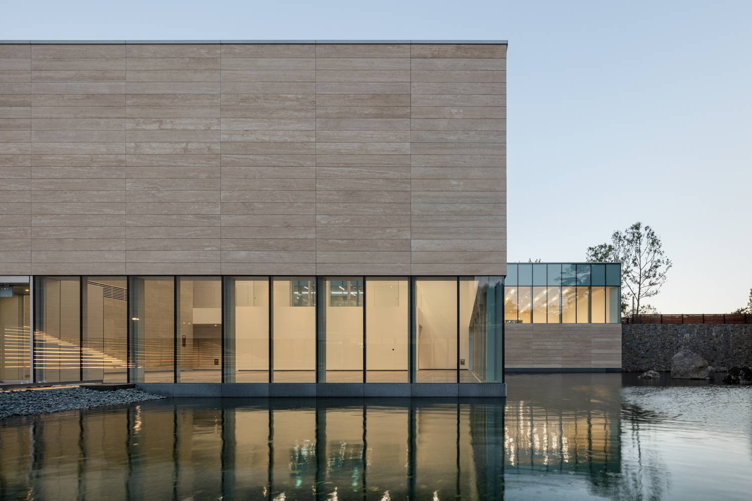 The upper levels of the Territorial Defense Memorial Hall and the Dokdo Experience Space are decorated with solid stone, while the lower levels are decorated with transparent glass. The glass on the lower level allows for communication between indoor and outdoor spaces, permitting observation of the exhibition and its spaces from the outside, while also allowing those inside to view the natural scenery of Yukhyangsan Mountain and Yukhyangji Pond. In the multi-purpose community space, which is set up for local residents, the upper level also uses glass to emphasize a sense of openness. This project uses travertine, which harmonizes with the natural environment, and the 2400 × 300mm module emphasizes the directionality of the long and narrow building body. The exit of the lower part of the building body is composed of 1200mm (half of the stone module), and the indoor floor is finished with 600 × 600mm square stones. Therefore, the indoor and outdoor areas of this project are connected not only visually or along the circulation path but also unified in terms of indoor and outdoor modules.