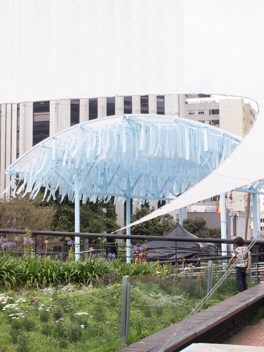 河流意象的抽象表达与文化激活:设计深度融合了对波哥大城市水系统和河流的哲学思考。顶棚采用的流动材质和内部“幻影河流”的装置,通过15,000片蓝色织物碎片对水体的动态特性进行抽象再现。风吹动碎片产生的位移,不仅与河流的物理属性形成对话,更在光影变化中营造出不断变化、富有生命力的内部氛围。这种设计策略成功地将文化活动与场地记忆(河流记忆)紧密联系起来,实现了城市空间的功能性激活与文化叙事的统一。