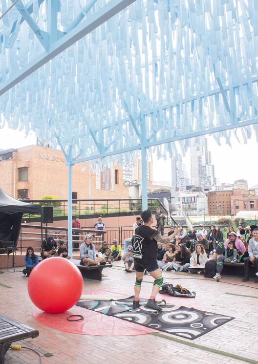 作为初始安装地点和功能测试地,选择了位于独立公园与波哥大现代艺术博物馆之间的由建筑师吉安卡洛·马赞蒂(Giancarlo Mazzanti)设计的双百年公园。在这样一个缺乏明确尺寸秩序且地形多变的环境中,“河流记忆”以类似于河流在山谷中自然流淌的方式进行了适应性布局。该项目耗时四周建成,已举办了包括美食、马戏、艺术与戏剧表演在内的各种文化活动。2026 年上半年,该项目将继续留在此地,随后将在城市的不同地点进行巡回安装,巩固其作为移动文化基础设施的地位。