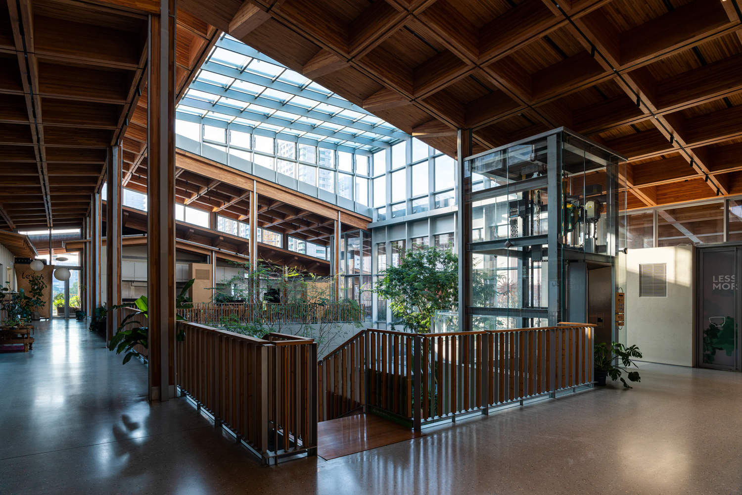 Under the main roof, we added an inwardly projecting eaves "house-within-a-house" small roof for each shop, creating an indoor street atmosphere around the atrium for the marketplace's second floor. Chunxi Marketplace fully employs low-carbon prefabricated construction technology. The main structure adopts a steel-wood composite form, the facade materials are mainly glass strip windows and UHPC dry-hanging systems, and modular steel-wood composite railings, while the roof uses aluminum-magnesium-manganese sheets stacked with photovoltaic components, with partial stainless steel pitched roof green planting grids.