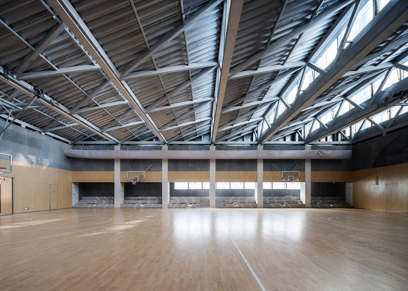 The main structure of Gulang Gymnasium is a cast-in-place reinforced concrete frame structure, and the roof of the ball court adopts a steel truss structure. Except for the glass curtain walls, the enclosure walls are clad with large-format, dry-hung, fluorocarbon-sprayed aluminum sandwich panels, and the facade framework is made of refined steel. We conceal the physical volume of the ball court by setting it back from the main street through the transparent volume of the street-facing, full-height entrance hall. Steel truss frameworks supporting planter boxes are suspended outside the glass curtain wall of the entrance hall and extend northward along the east facade, forming a large-scale vertical greening device facing the street and the sports lawn, providing a strong visual cue.
