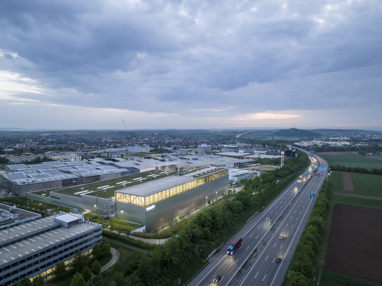 通快集团起家于 1960 年代后期,在德国 A81 高速公路沿线拥有生产车间和办公楼。这一公司在过去几十年里已发展成为一家成功的高科技公司,拥有面向未来的创新工业园区,甚至发展成为一个工业村。除了生产车间和行政大楼外,该园区还配有培训中心、日托中心、各种服务于食品、音乐、讲座或聚会的活动空间、供人休息放松的花园和公园、配有电动车和自行车停车位的停车场、以及当下新落成的健身运动中心。