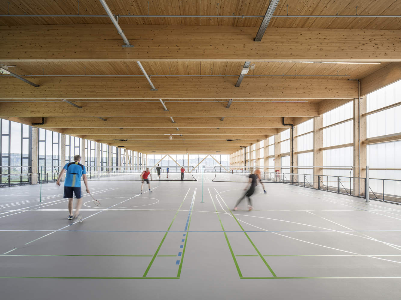 To reduce the weight of the roof structure and carbon dioxide emissions, the extension uses a prefabricated timber structure made of simple and economical glued laminated spruce wood, forming a single-story space with a mezzanine. The net span of the trusses in the hall reaches 23.5 meters with a height of 1.2 meters; the span width in the fitness area is correspondingly halved. The glass south facade of the sports and fitness center consists of a continuous double-skin facade (to shield it from the noise of the busy motorway). In addition, the architects supplemented the fitness equipment area with insulating glass layers and sun/wind protection.