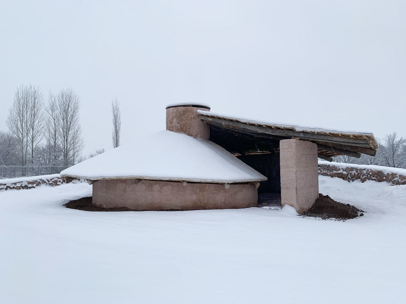 After the foundation was laid, a wind barrier was built around the shelter walls, filled with earth, rising and attenuating in a curved manner to slow down and control the strong winds coming from the northwest. The earth was piled up behind the stone retaining walls, and the accumulation was expected to settle and return to its natural state within a year.