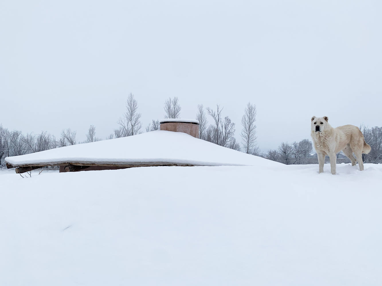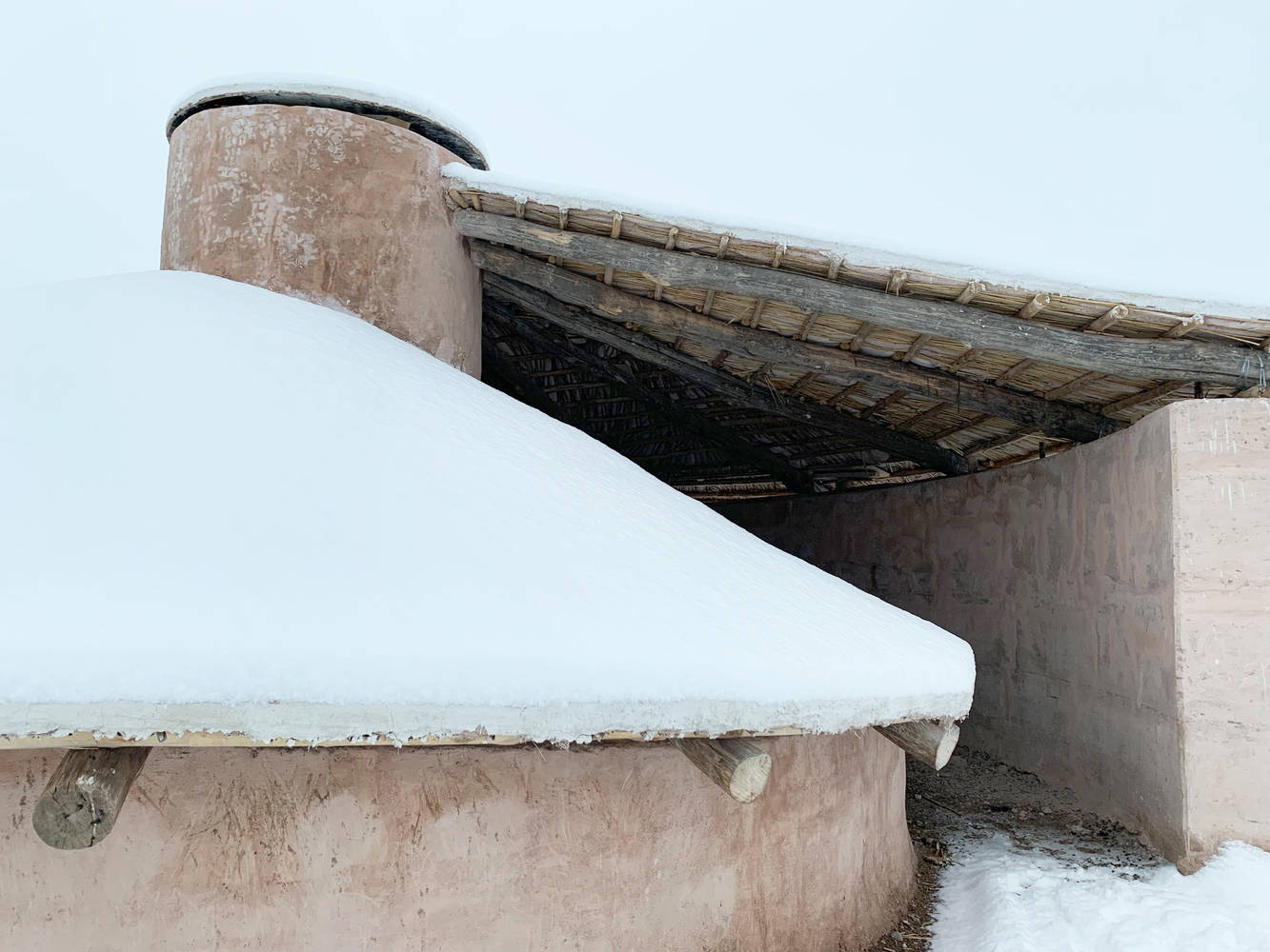 屋顶覆盖层由矮灌木、黄麻和陶土土质材料制成,并在细节处创造了一个高度抗雪载的大坡度。考古学的修复技术创造了一个防水且免维护的层。混合物包括水力石灰、奶油石灰、珍珠岩砂、石膏和瓦片灰。覆盖斜度不定的半圆形墙壁的屋顶形式,也由可变的坡度组成。庇护所后面是曲线型的人工地形,以保护山羊、屋顶和墙壁不被风吹到。建筑和屋顶的形式应要求十分和谐。在盛行风向的屋顶形式的帮助下,风会吹过屋顶斜坡。