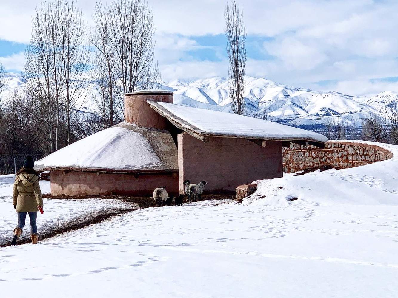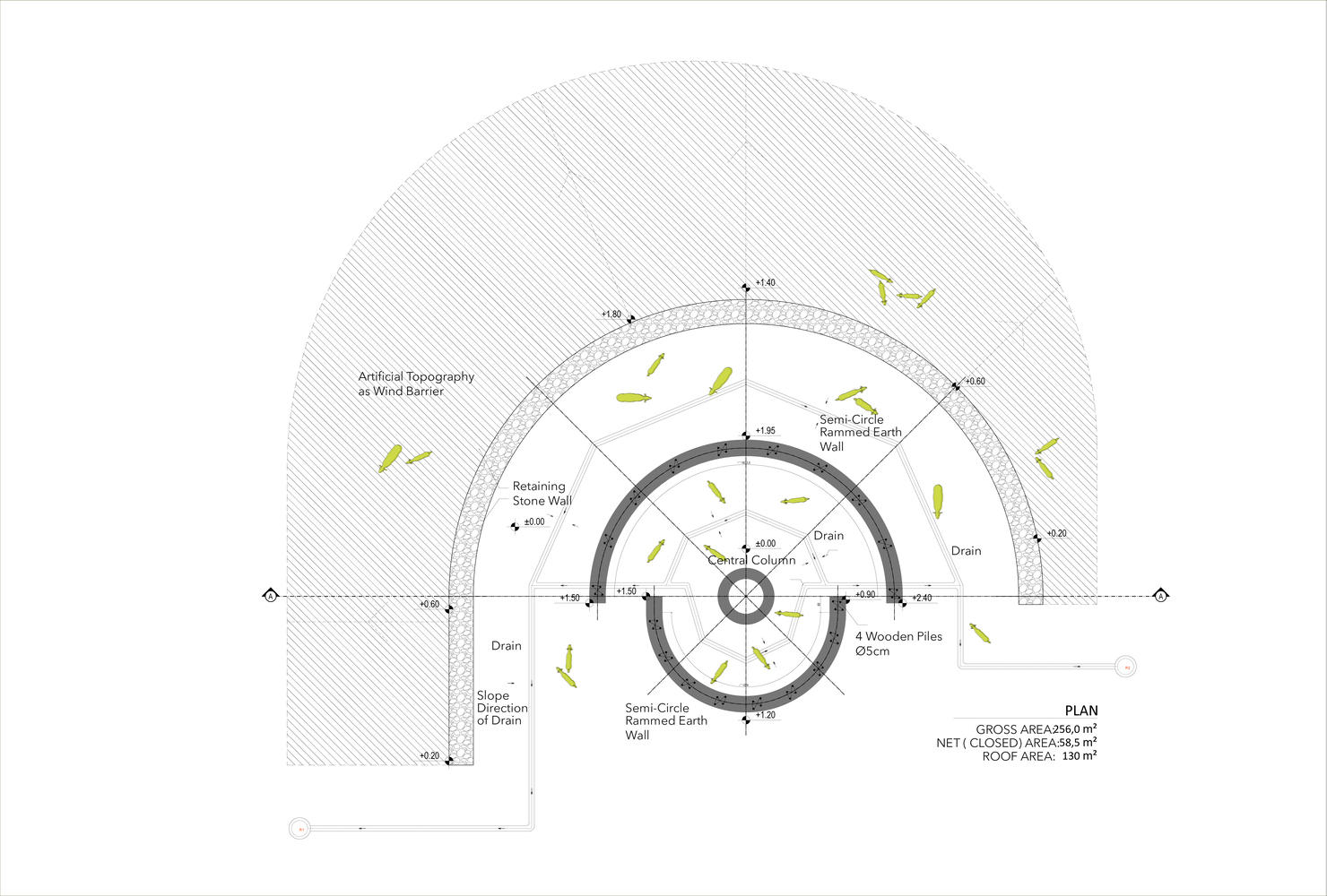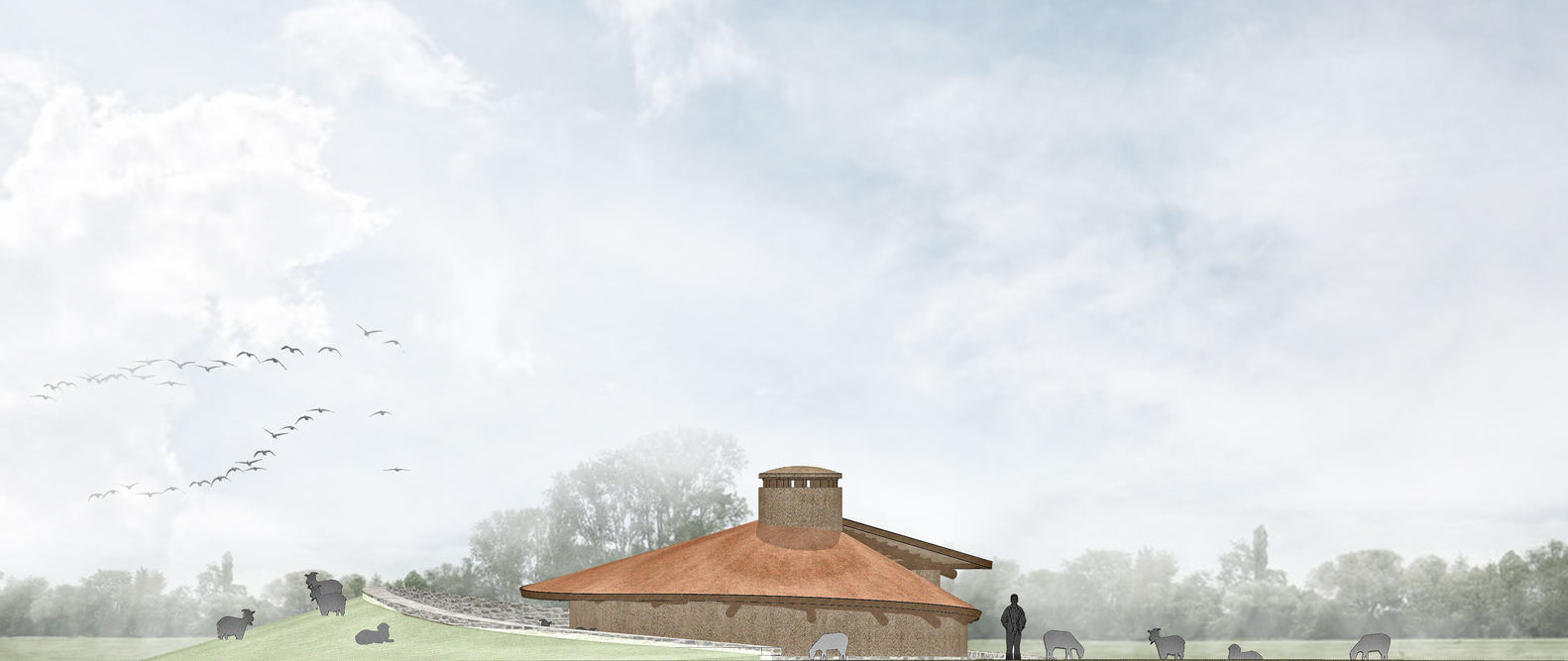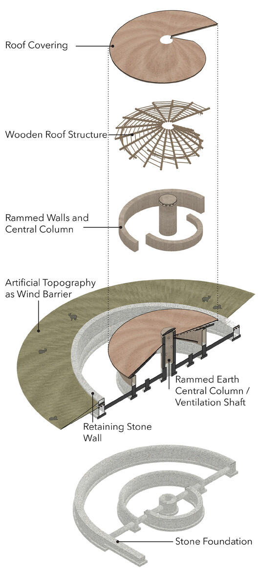 The roof covering consists of low shrubs, jute, and earthen materials, and creates a steep slope at the detail that is highly resistant to snow loads. An archaeological restoration technique created a waterproof and maintenance-free layer. The mixture includes hydraulic lime, cream lime, perlite sand, gypsum, and tile ash. The roof form, which covers the semi-circular walls with irregular slopes, also consists of variable slopes. Behind the shelter is a curved artificial topography that protects the goats, the roof, and the walls from the wind. The form of the building and the roof are required to be very harmonious. With the help of the roof form in the direction of the prevailing winds, the wind blows over the roof slopes.