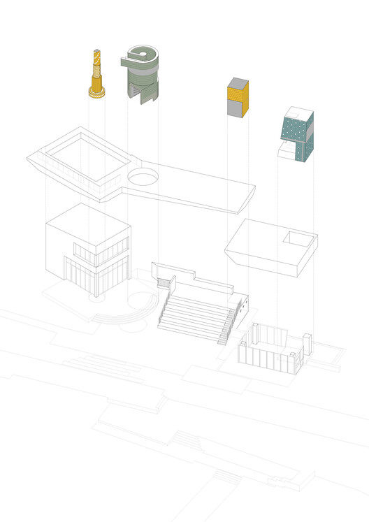 The cluster of buildings is arranged along the inner bay waterfront, adjacent to the paddleboard dock and backed by the non-powered children's playground. The overall layout references the enclosed structure of traditional Minnan settlements, following the pattern of "front courtyard, rear dwelling" (Qian Cheng Hou Cuo). The south side opens towards the water, organizing spaces around a central entrance plaza and public grand staircase resembling a "Cheng" (courtyard). The west side houses the two-story main sports store, the east side features single-story retail pavilions, and the north side backs onto the playground. The grand staircase serves as a place for watching events, waiting, and resting, offering the public a seaside platform for contemplation and lingering.