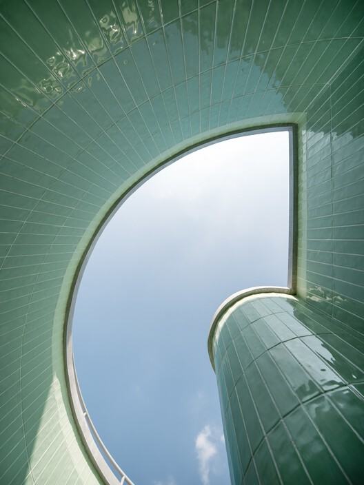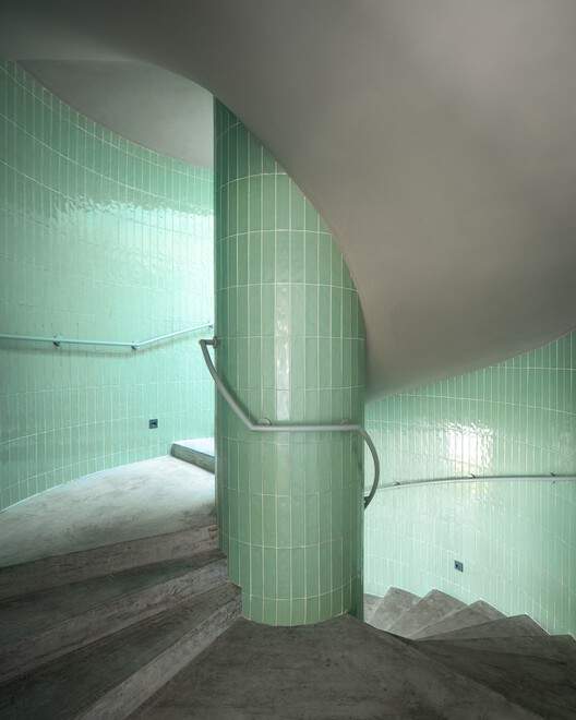 空间体验与材料的导向性:建筑在功能布局和材料运用上展现出清晰的导向策略。连续的大挑檐不仅提供了必要的遮蔽,其变化的几何形态也引导了自然光线。在材料层面,通过在关键结构和交通空间(如旋转楼梯间、核心筒)使用色彩和纹样各异的釉面花砖,设计在缺乏传统街道界面的海岛环境中,为使用者提供了明确的空间识别线索。这种材料的“着色”策略,既丰富了建筑的视觉层次,也巧妙地强化了空间的功能分区与导向逻辑。