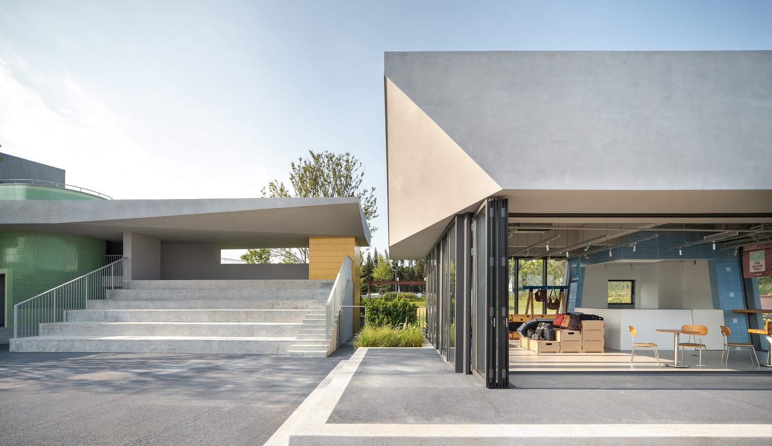 The two-story main sports store on the west side, the central grand staircase, and the cylindrical spiral stairwell embedded within them are covered by a continuous large eaves, unifying them. The single-story retail building on the east side also has an independent overhanging roof. Inspired by the unique "Swallowtail Ridge" (Yan Wei Ji) roofs of Minnan residences, and echoing the streamlined curves of paddleboards, the eaves slightly curve upwards at the corners, forming covered, sheltered transitional spaces (grey areas) that shield from sun and rain. Their variable cross-section geometry also facilitates structural cantilevering and guides soft natural light deep into the interior spaces.