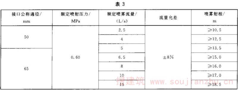 5.1.1.2 喷雾水枪在额定喷射压力时,其额定喷雾流量和喷雾射程应符合表3的要求。