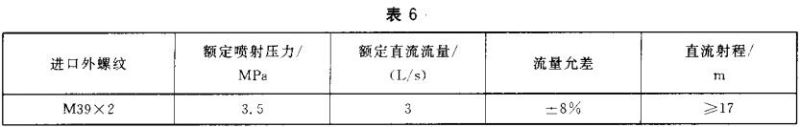 中压水枪在额定喷射压力时,其额定直流流量和直流射程应符合表5的要求,其最大喷雾角时的流量应在表5额定直流流量的100%~150%的范围内,流量允差为±8%。