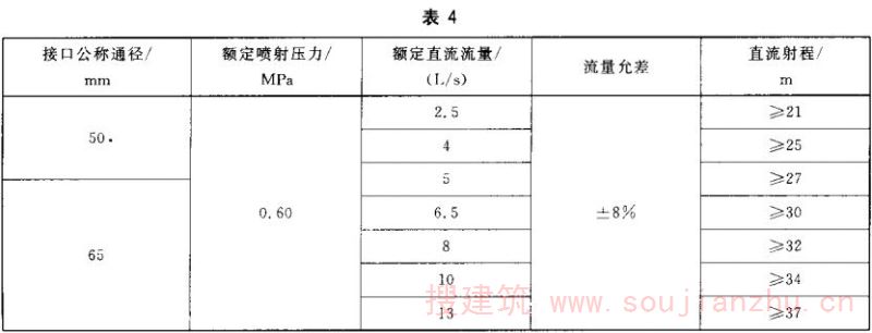 5.1.1.4 多用水枪在额定喷射压力时,其额定直流流量和直流射程应符合表4的要求,其额定喷雾流量应在表4额定直流流量的92%~108%范围内,流量允差为±8%。