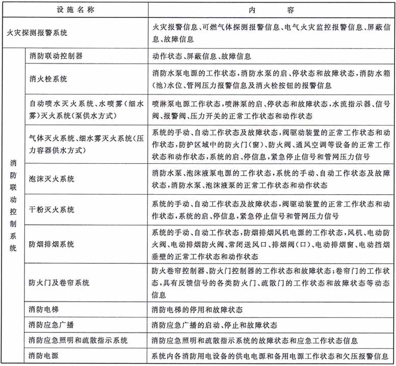 3.2 消防控制室内设置的消防设备应能监控并显示建筑消防设施运行状态信息,并应具有向城市消防远程监控中心(以下简称监控中心)传输这些信息的功能。建筑消防设施运行状态信息见附录A。