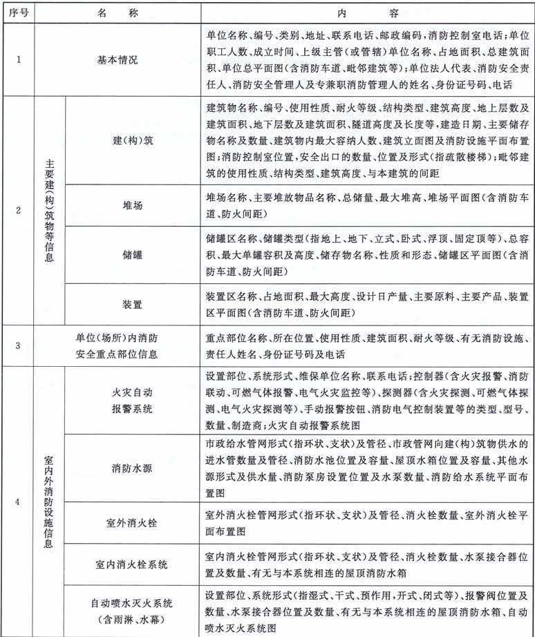 f) 消防设施一览表,包括消防设施的类型、数量、状态等内容;