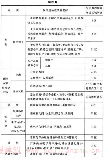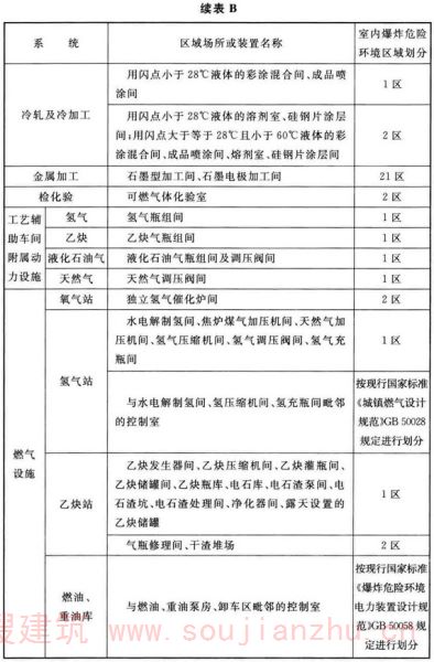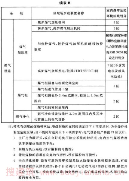 (1)对于爆炸性气体混合物环境,其区域的划分,现行国家标准《爆炸危险环境电力装置设计规范》GB50058是按环境内的情况和气体释放源级别及距离确定。本附录根据钢铁冶金企业的工艺特点和管理实践,并结合各专业规范,以厂房内环境为单位进行划分和举例。但某些专业规范以介质特性、释放源及距离确定者,仍以《爆炸危险环境电力装置设计规范》GB50058为准。现行国家标准《爆炸危险环境电力装置设计规范》GB50058规定: