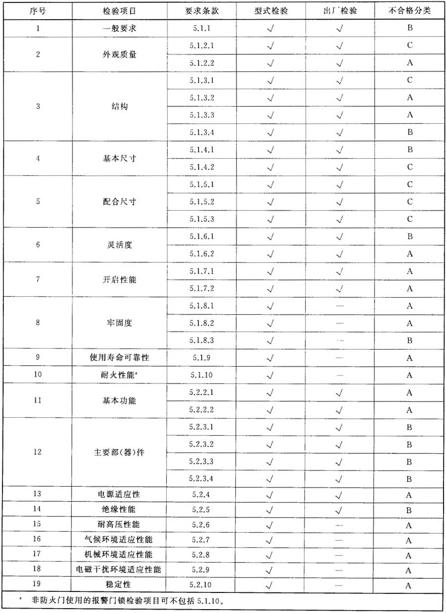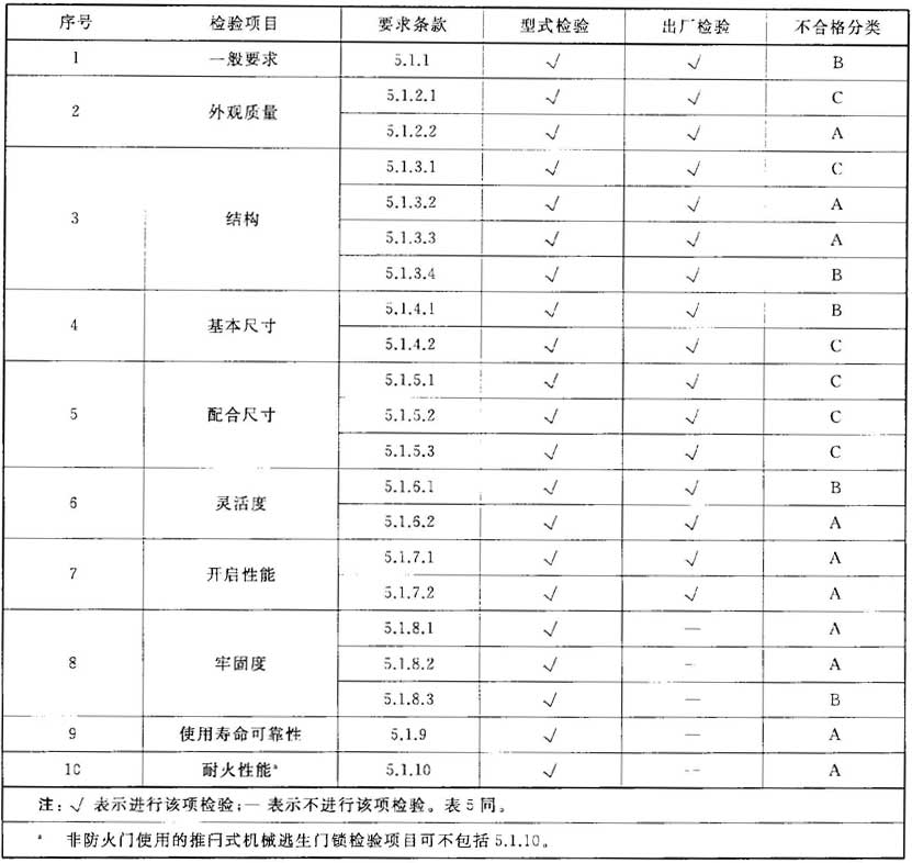 7.1.2 推闩式机械逃生门锁型式检验、出厂检验项目和不合格分类见表4;报警门锁型式检验、出厂检验项目和不合格分类见表5。