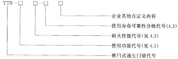 示例1:TTS-JF1.50-Ⅱx表示推闩式机械逃生门锁,耐火性能为1.50h,寿命可靠性级别为Ⅱ级,企业自定义产品代号为x。