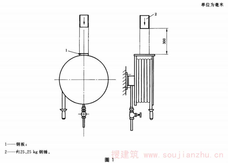 6.5.1 如图1所示,按制造厂规定的安装方法,将试样固定安装在冲击试验架上,使试样通路灌满水,然后将截面为100 mm×25 mm,长度比卷盘两侧板间距略长的钢板平放在两侧板上;将质量25 kg、直径125 mm的钢锤从距离钢板上平面300 mm处自由落下冲击钢板1次,落点为两侧板中央位置。冲击后再按6.2进行试验,其结果应符合5.2规定。