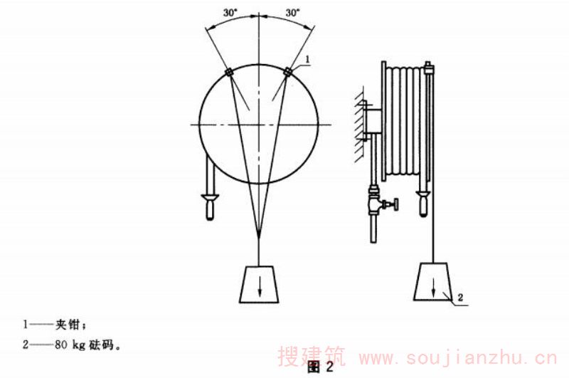 6.5.2 按6.5.1规定安装试样并灌水。如图2所示在卷盘侧板上悬挂质量为80 kg砝码。72 h后去除砝码,再按6.2规定进行试验,其结果应符合5.2规定。旋转轴仅为1个支承点的卷盘,悬挂点应距支承点最远。旋转轴多于1个支承点的,悬挂点应通过各支承点的支承中心。
