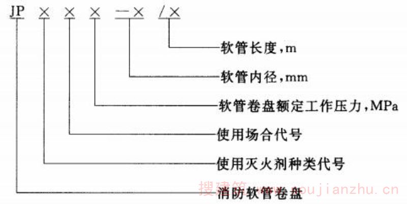 灭火剂为水、额定工作压力为0.8MPa,软管内径为19 mm,软管长度为25 m的软管卷盘,其型号为:JPS0.8—19/25