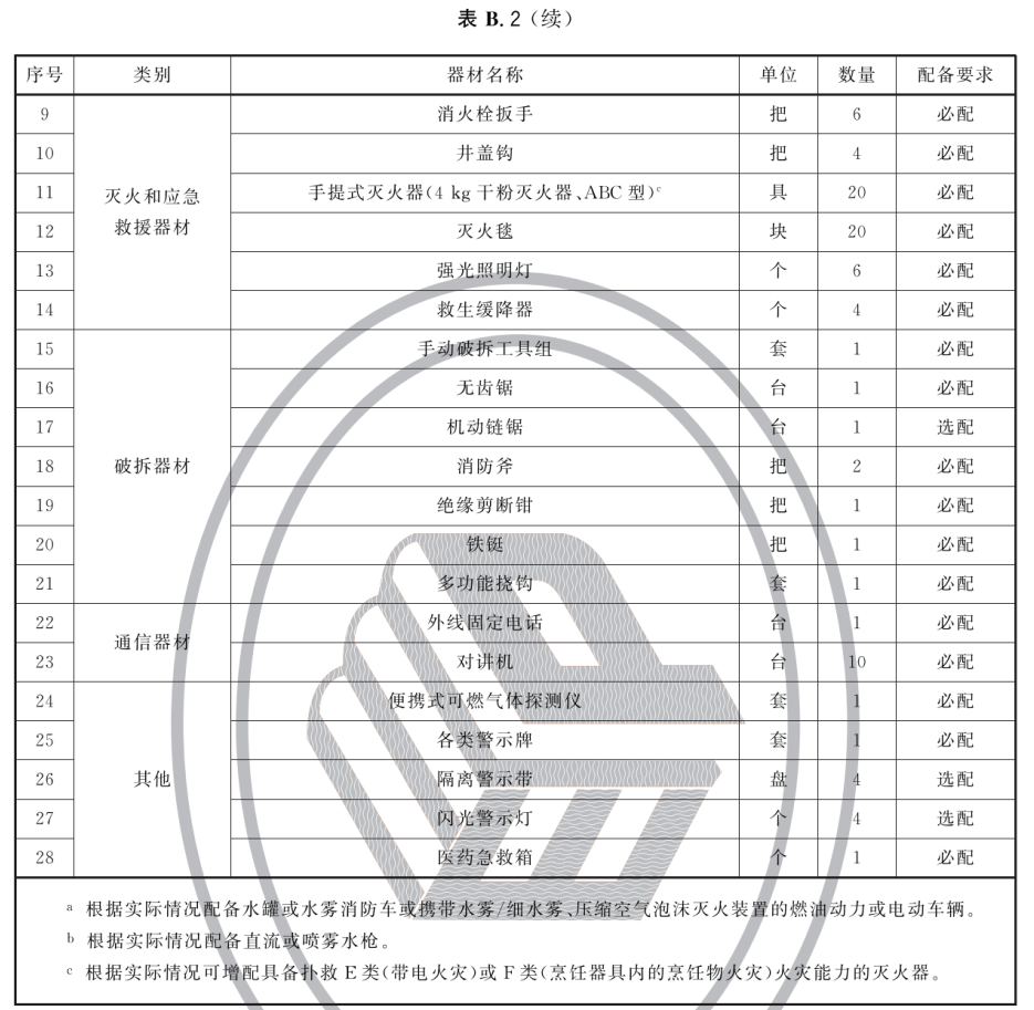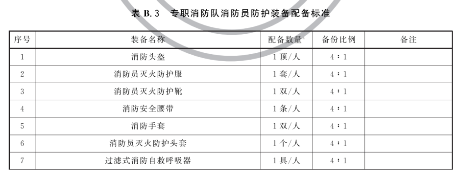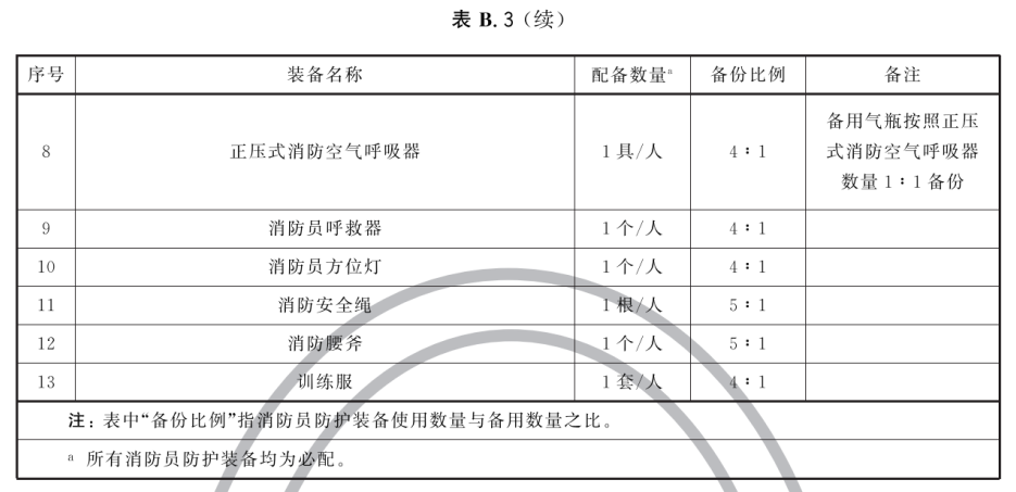 B.2 专职消防队灭火和应急救援装备器材配备标准、专职消防队消防员防护装备配备标准分别见表B.2、表B.3。