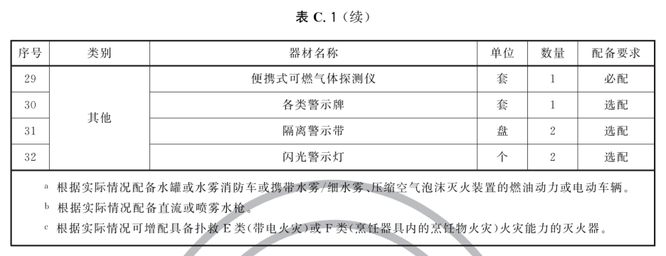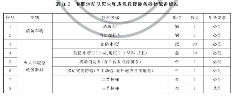 17.5 专职消防队、微型消防站应根据本场所火灾危险性特点,配备一定数量的灭火、通信、个人防护等消防(车辆)器材装备。专职消防队的装备器材可参考表B.2、表B.3配备,微型消防站装备器材配备标准应符合附录C的规定。