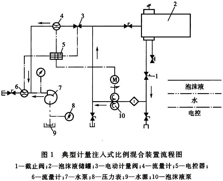 泡沫液泵直接向系统水流中按设定比例注入泡沫液的比例混合流程。