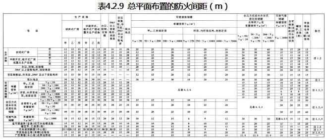 4.2.9 总平面布置的防火间距,不应小于表4.2.9的规定。