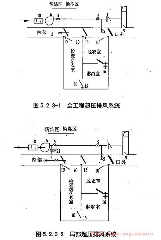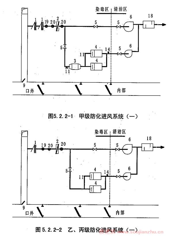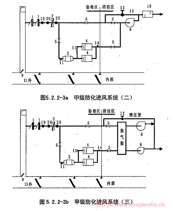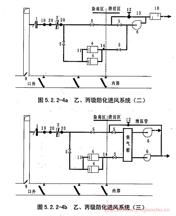 2.0.2增压管的英文由overpressure tube改为booster tube。增压管过去曾叫做超压管overpressure tube,因“超压”的要求用在此段进风管上过于严格,后将超压管改为增压管,但是英文词并未改。《英汉防化科技词汇》P26页有相似的词booster pump,在这里将增压管的英文名称改为booster tubc。 滤毒通风与清洁通风共用风机时,密闭阀门并非绝对气密,滤毒通风时在风机的抽力下,清洁管道上的两道密闭阀门之间会出现负压,一部分染毒空气会通过清洁管道上两道密闭阀门被抽入工程主体,对工程内人员造成危害。增压管的作用是在清洁式进风管道的两个密闭阀门间形成“气闸”,防止外界染毒气体在阀门气密性能较差时从清洁式进风管被吸入工程清洁区。 清洁式进风管道与滤毒式进风管道呈并联的进风系统包含两种情况,一是清洁式通风与滤毒式通风共用风机;二是清洁式通风与滤毒式通风分设风机,但在两个风机前设置了一个集气箱。第二种情况虽然清洁式通风与滤毒式通风分设风机,但是集气箱将清洁通风管道与滤毒通风管道相连通,滤毒风机开启后,清洁通风管道风机吸入端实际上形成了负压,会将染毒空气抽入工程主体,造成工程内部染毒,其效果相当于滤毒通风与清洁通风共用风机,因此这种情况也要设增压管。