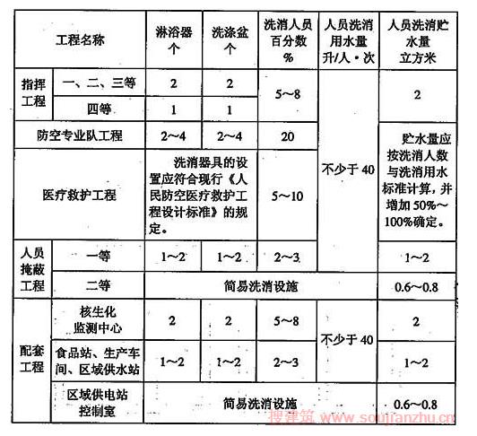6.2.1第一防毒通道或缓冲通道内应设置工程口部洗消用的给水管和闸阀,管径为1英寸。工程口部染毒区洗消用水标准应按5L/m²~10L/m²计,指挥工程贮水量应为标准用水量的2倍。