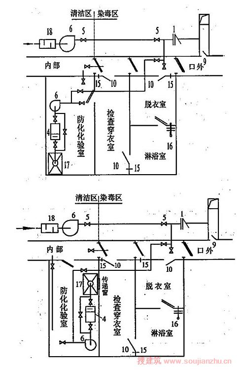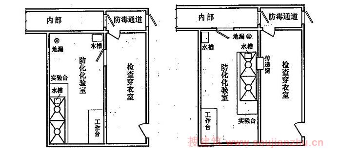 1 防化化验室的面积不小于12m²,应设密闭门,当防化化验室与检查穿衣室之间的隔墙上设样品传递密闭窗时,其密闭门与工程主体相通,当不设样品传递密闭窗时,其密闭门与第二防毒通道或检查穿衣室相通;