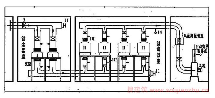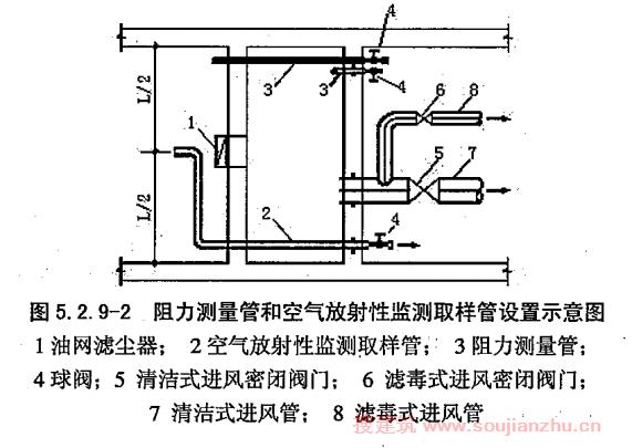 8.0.2空气放射性监测由取样和测量组成。防化级别为甲级的工程取样操作点设在滤尘器室,其它防化级别的工程取样操作点设在滤毒器室。取样管设置见图5.2.9-2。
