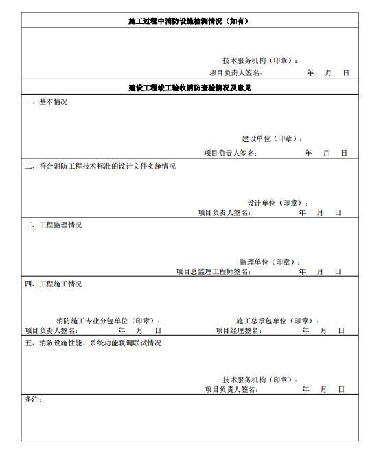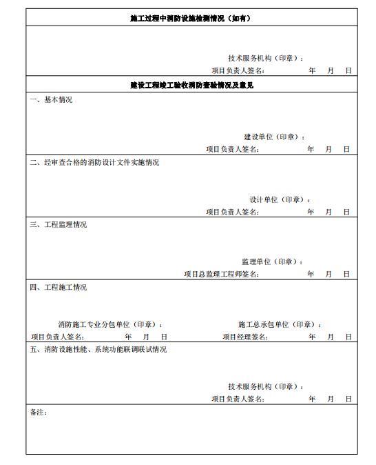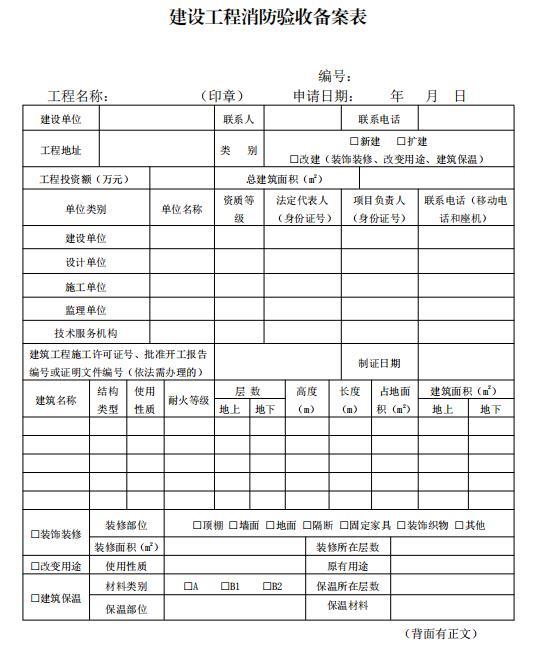 1.填表前建设单位、设计单位、施工单位、监理单位、建设工程消防技术服务机构应仔细阅读《中华人民共和国建筑法》《中华人民共和国消防法》及《建设工程质量管理条例》《建设工程消防设计审查验收管理暂行规定》等有关规定。
