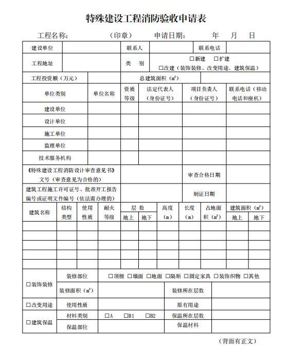 12.《特殊建设工程消防验收申请表》中“备注”一栏所填内容可包括:(1)工程是否跨行政区域等相关情况;(2)建设工程涉及储罐、堆场的,详细阐述储罐的设置位置、总容量、设置形式、储存形式和储存物质名称,堆场的储量和储物质名称等;(3)如本次属于再次申请验收,以前的验收的具体问题和整改情况;(4)其他相关情况。