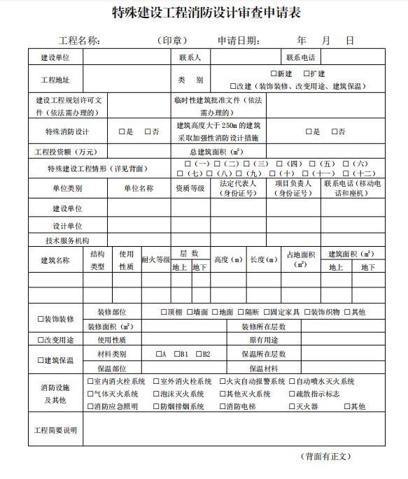 11.《特殊建设工程消防设计审查申请表》中“工程简要说明”一栏所填内容可包括:(1)逐一填写各层使用功能,建筑的防火设计类别;(2)装修工程应注明装修场所的具体使用情况,是否改变所在建筑原防火设计类别的消防设计;(3)工程消防设计文件变更的,应注明具体情况;(4)城市隧工程应注明隧道工程类型(如山体隧道、河底隧道等);(5)除房屋建筑和市政基础设施建设工程以外的其他类建设工程,应注明行业主管部门的相关工程审批情况;(6)如该建设工程进行特殊消防设计,应注明设计采用的国际标准、境外消防技术标准的名称及中文翻译文本的名录;(7)建设工程涉及储罐、堆场的,详细阐述储罐的设置位置、总容量、设置形式储存形式和储存物质名称,堆场的储量和储存物质名称等;(8)其他相关情况。