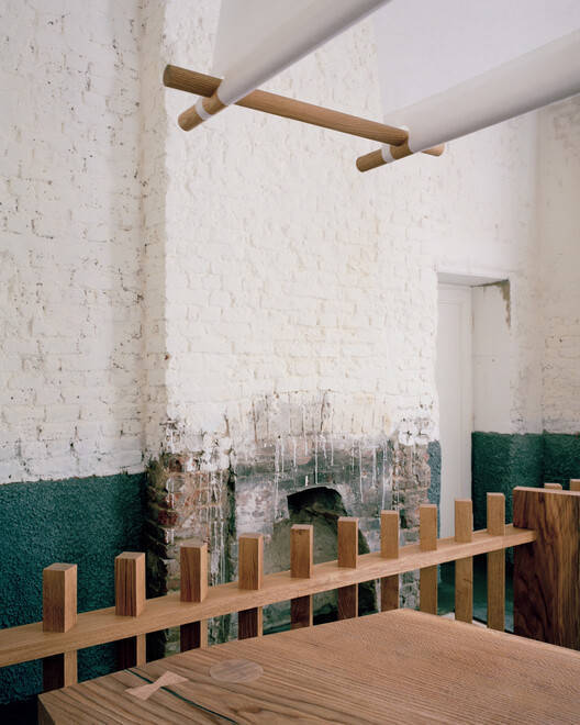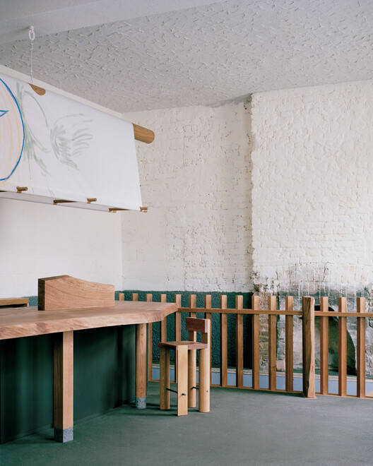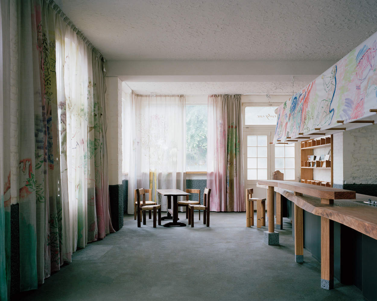 The surfaces of the old brick building are lined using local know-how. While the existing walls are painted with limewash and old-fashion roughcast, the ceiling is covered by a hand-textured lime plaster. The beaten earth floor, commonly used in the early days of countryside pubs, is made of a mix of soil, straw and clay with a natural linseed oil coating. Reclaimed Yorkstone slabs are used in the garden and floor area with heavy traffic. Artist Lucy Stein hand-painted the large hessian curtains embracing the space. Inspired by British folklore and mythology, the natural stain on the fabric filters the light entering the pub as stained glass windows in the past. Her evocative and radically contemporary motifs might best express the contradicting but fascinating relation between globalized issues and the local discourse praised by Morris two centuries ago.