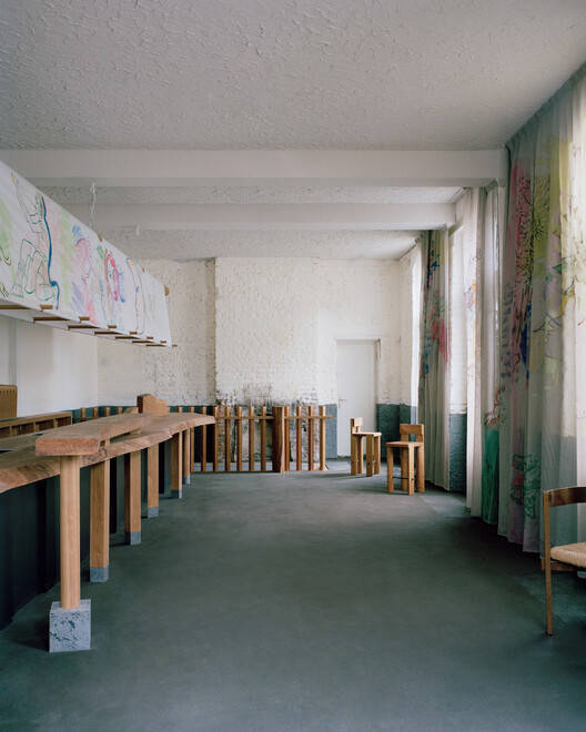 传统与现代的碰撞:旧砖房的表面采用当地技术衬砌,既有石灰水和老式毛坯的墙面,又有手工纹理的石灰灰泥天花板,还有早期乡村酒吧常用的打过的泥土地板。同时,艺术家手绘的大麻布窗帘受英国民间传说和神话启发,过滤光线如彩色玻璃窗。这一设计体现了全球化问题与两个世纪前莫里斯赞扬的当地话语之间矛盾又引人入胜的关系,实现了传统与现代的精彩碰撞。