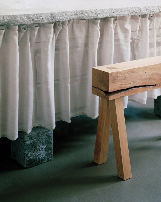 The ten meters long timber bar, laying unconventionally low, is the central element of the space and acts as a counter, a kitchen bench, a dining table. Somehow inspired by rustic and vernacular joinery, the bar and surrounding custom made furniture are entirely built out of one single large oak tree. Each part of the trunk is carefully used, revealing the veins, the bark and the cracks of this century-old giant. The bespoke stools and lights are created with the same solid oak combined with Japanese hemp fiber paper, hand casted Italian glass, volcanic stone and oxidized brass. Italian grotesque and Japanese wabi-sabi casually meet English medieval revival in an eclectic mixture of assumed cultural references.