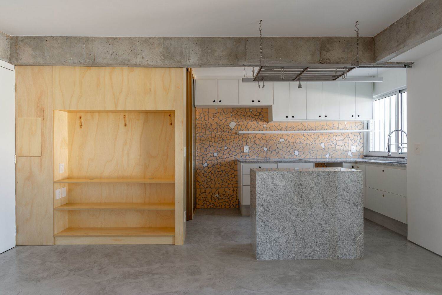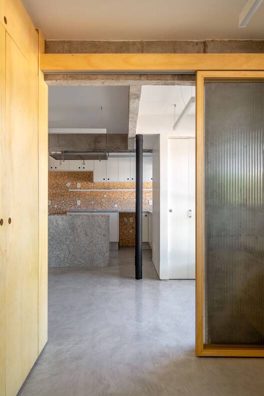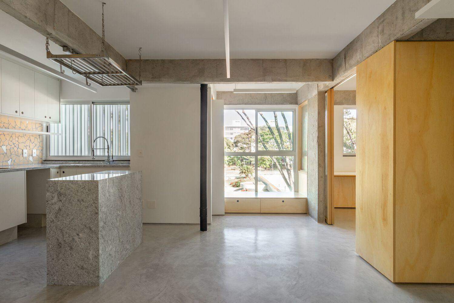 The apartment's original structure was stripped to show the exposed concrete, which becomes a central element and guides the choices of finishes, textures, and colors in the project. The entire apartment floor was covered with microcement, providing a neutral and continuous base that connects the spaces and visually expands the area.