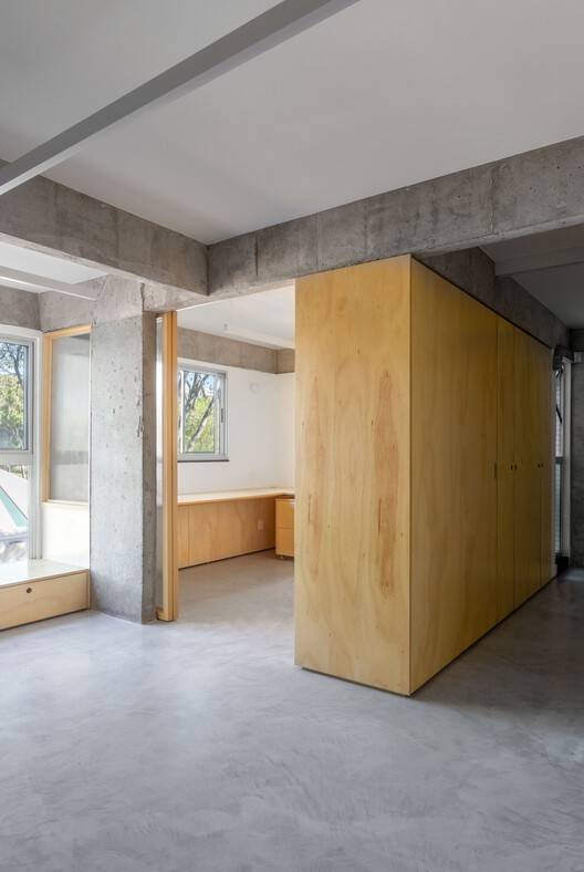 整个空间被整合在一起,胶合板橱柜在组织和分隔区域方面发挥着核心作用,同时提供存储和功能。滑动木门和凹槽玻璃门用于将客厅与办公室隔开,将厨房与洗衣房隔开,在不影响自然光和开放感的情况下分隔空间。