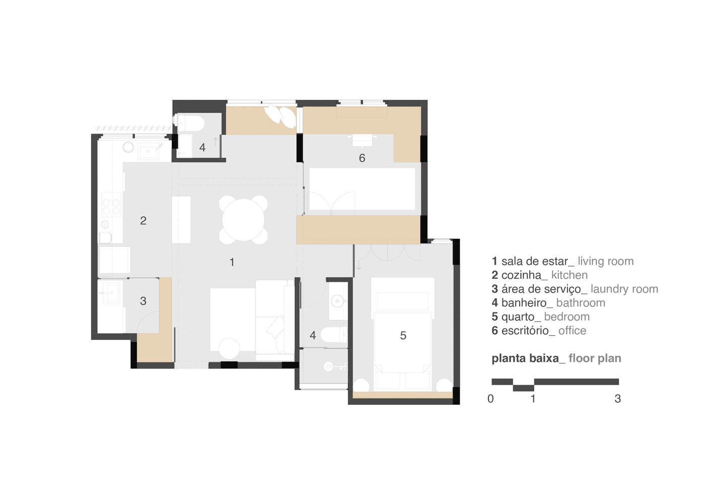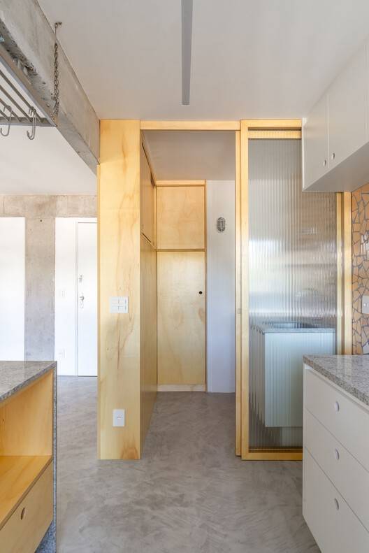 The entire space was integrated, and the plywood cabinetry plays a central role in organizing and separating the areas, while providing storage and functionality. Sliding wooden and fluted glass doors are used to separate the living room from the office and the kitchen from the laundry room, allowing the division of spaces without compromising natural light and the feeling of openness.