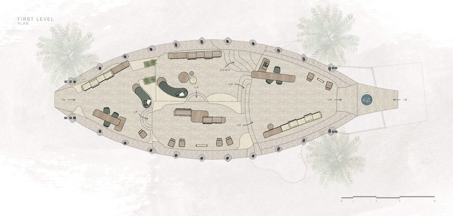作为受稻田纹理、形状和高度启发的原始建筑,Conchita Blanco强烈认为室内设计需要从茂密的树林中脱颖而出,成为建筑本身的一部分。