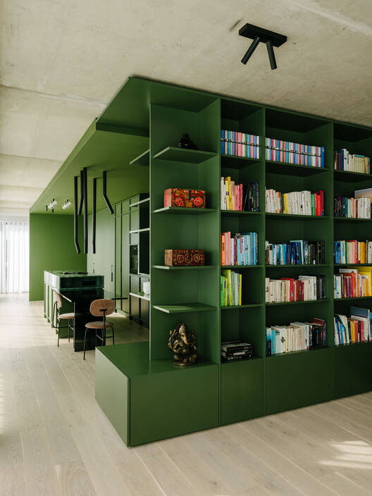Text description provided by the architects. The apartment uses strong colors, natural materials, precise planning, contrasts of cool and warm – and a few surprises. By locating a single but complex green millwork box at the center of the long apartment, circulation can flow around all sides and the design makes the most of existing material conditions. The palette of rich colors and materials contrasts with neutral raw concrete walls and ceilings to harmonize cool and warm.