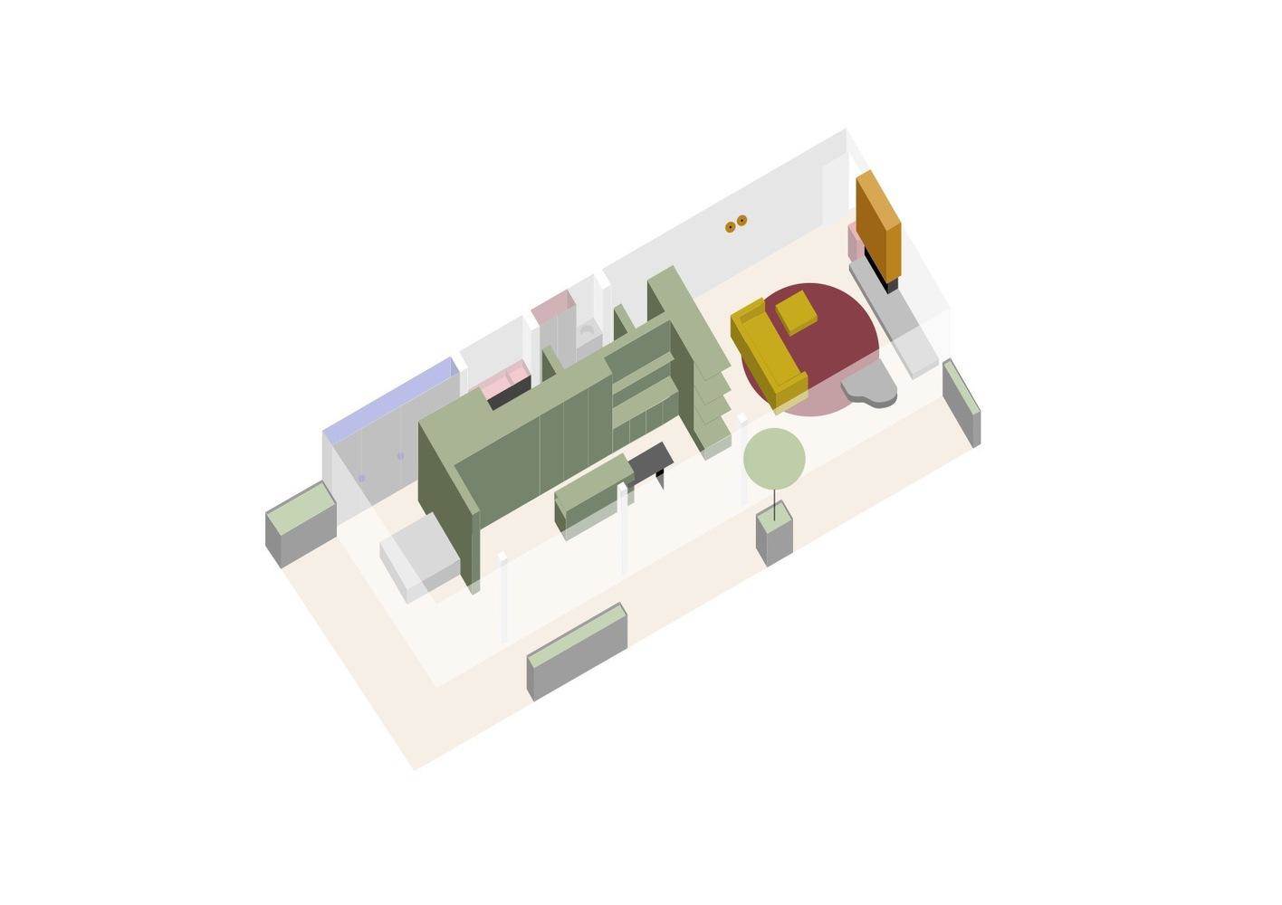 建筑师提供的文字描述这套公寓使用了强烈的色彩、天然材料、精确的规划、冷暖的对比,以及一些惊喜。通过在长公寓的中心放置一个单一但复杂的绿色木制品箱,流通可以在四周流动,设计充分利用了现有的物质条件。丰富的色彩和材料与中性的混凝土墙壁和天花板形成对比,以协调凉爽和温暖。