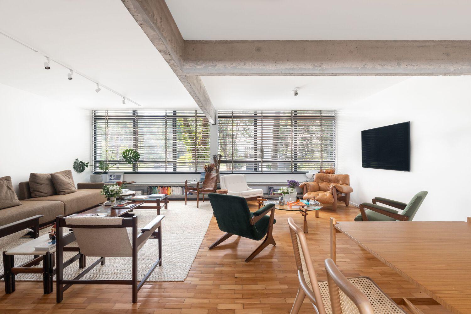 The property had undergone a previous renovation that excessively compartmentalized the space. Therefore, the intervention carried out by BLOCO Arquitetos removed several walls to integrate most of the spaces, meeting the residents' needs and revealing part of the original structure, such as the beams. The original wooden floor was removed, restored, and reinstalled. One of the most significant changes was the repositioning of the kitchen, now fully integrated into the dining and living room, with the inclusion of a side support space that features a wine cabinet. In this new layout, the appliances are partially exposed, while the refrigerator – the largest of them – was "hidden" from the living room view, positioned in the adjacent room, which also functions as a service area. In the layout, the first bedroom was annexed to the living room, while the second transformed into a TV room and office, with the possibility of closure by a steel and glass frame. The suite's bathroom was also repositioned and directly connected to the ventilated facade through the building's cobogós, where a garden was created. Designed to accommodate as many people as possible, the living area features two distinct environments that can be connected according to the residents' needs. In addition to the integration of the space, notable elements include the freijó woodwork and the curation of the furniture.