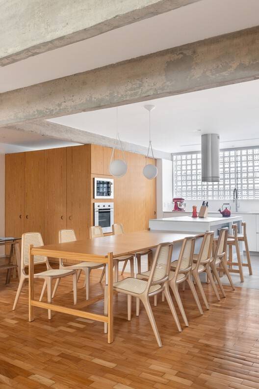 Text description provided by the architects. The first home of a couple, Apartment 114S received a renovation project signed by the Brasília office BLOCO Arquitetos, founded by partners Daniel Mangabeira, Henrique Coutinho, and Matheus Seco. The residents’ goal was to transform the apartment into a gathering place for family and friends. With this premise, the three-bedroom property was completely remodeled, creating a large social area with only one suite for the couple. Located in Superquadra 114 in Asa Sul, Brasília, the apartment had its social area expanded, and the kitchen integrated into the living room.