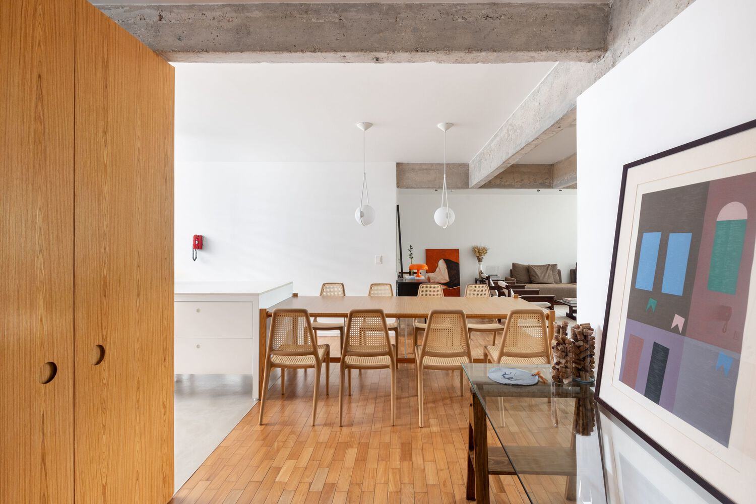 Among the pieces are the Lia, Mole, and Paraty armchairs by Sérgio Rodrigues; the Zeca armchairs and Fina and Zanini chairs by Zanine Caldas; the Grampo coffee table by Fernando Mendes; and the Vitrola sideboard by Felipe Protti. The lighting design also underwent a simple intervention. In the social area, tracks and surface-mounted fixtures were used, as well as two Corda pendants by Guilherme Wentz above the dining table and lamps on the side tables. Additionally, a Dot wall sconce by Alessandra Mourão was included in the social bathroom. The rest of the lighting was embedded in the ceiling. The entire renovation project was inspired by the characteristics of Brazilian modern architecture, especially found in Brasília, present in the apartment. Therefore, the intervention emphasizes simplicity and structural ingenuity – common traits of Brasília architecture.
