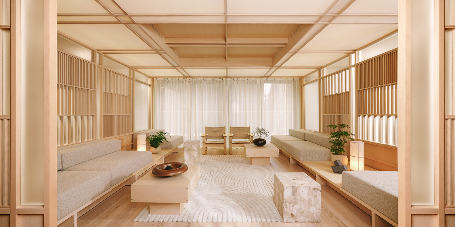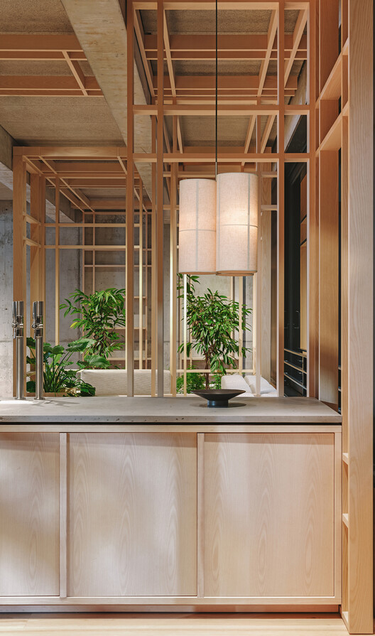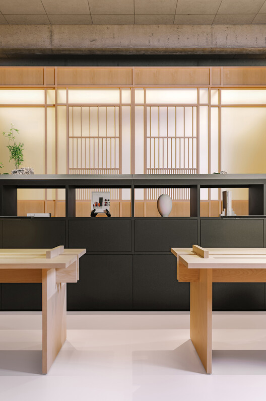 办公室设计采用天然木材纹理和结构,反映了大自然的色彩。有机材料在家具和装饰中的许多垂直元素中都得到了强调。日本的影响也体现在受和纸启发的表面上。该空间辅以与茶文化相关的元素,如制作精美的桌子、架子和休闲区,配有柔软的家具和茶吧。此外,办公室的焦点是茶馆,这是一座设计独特的木结构建筑,灵感来自茶亭。这个封闭的空间旨在进行亲密的交谈,为会议提供舒适和隐私。为放松和恢复活力而设计的绿色元素融入了受日本花园启发的形式。精选植物和天然石材的组合符合日本美学,将形式简单与精心挑选的色调相结合。