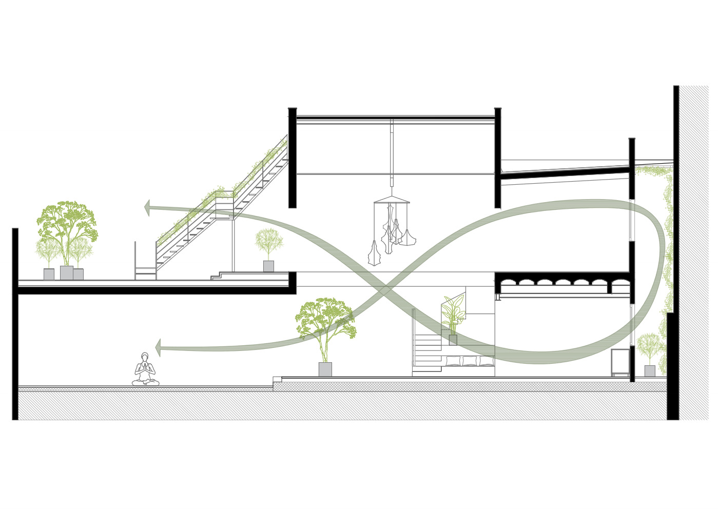 多元功能:轩兰瑜伽工厂功能丰富,中央双层空间的瑜伽馆,一楼的沙拉区、厨房、会议空间等,满足了不同需求。楼梯被设计成社交和沉思的地方,共享办公区见证工厂活动。露台的设计更是为与自然共存的活动提供了空间。航空热技术的运用,既节约能源又强化了对自然的尊重。整体设计展现了多元功能与自然之美的和谐统一。